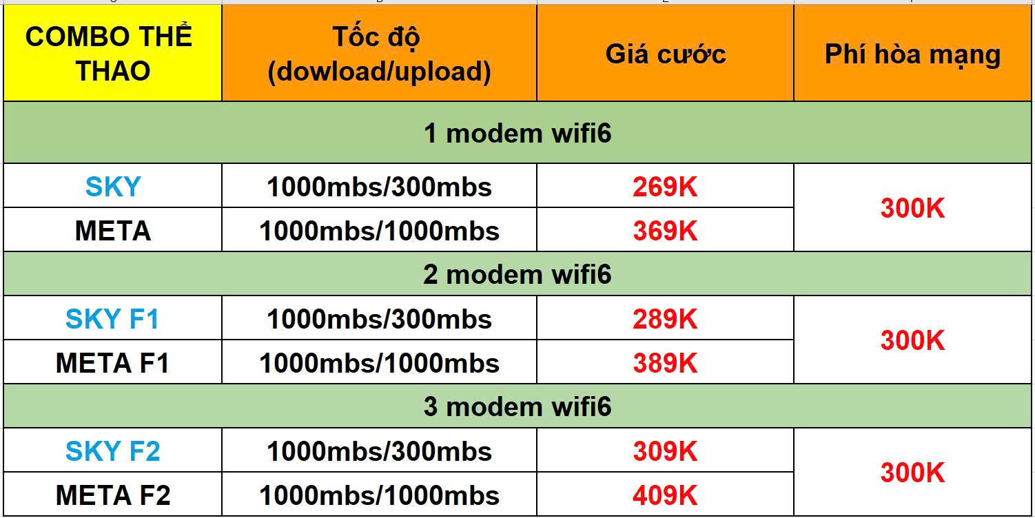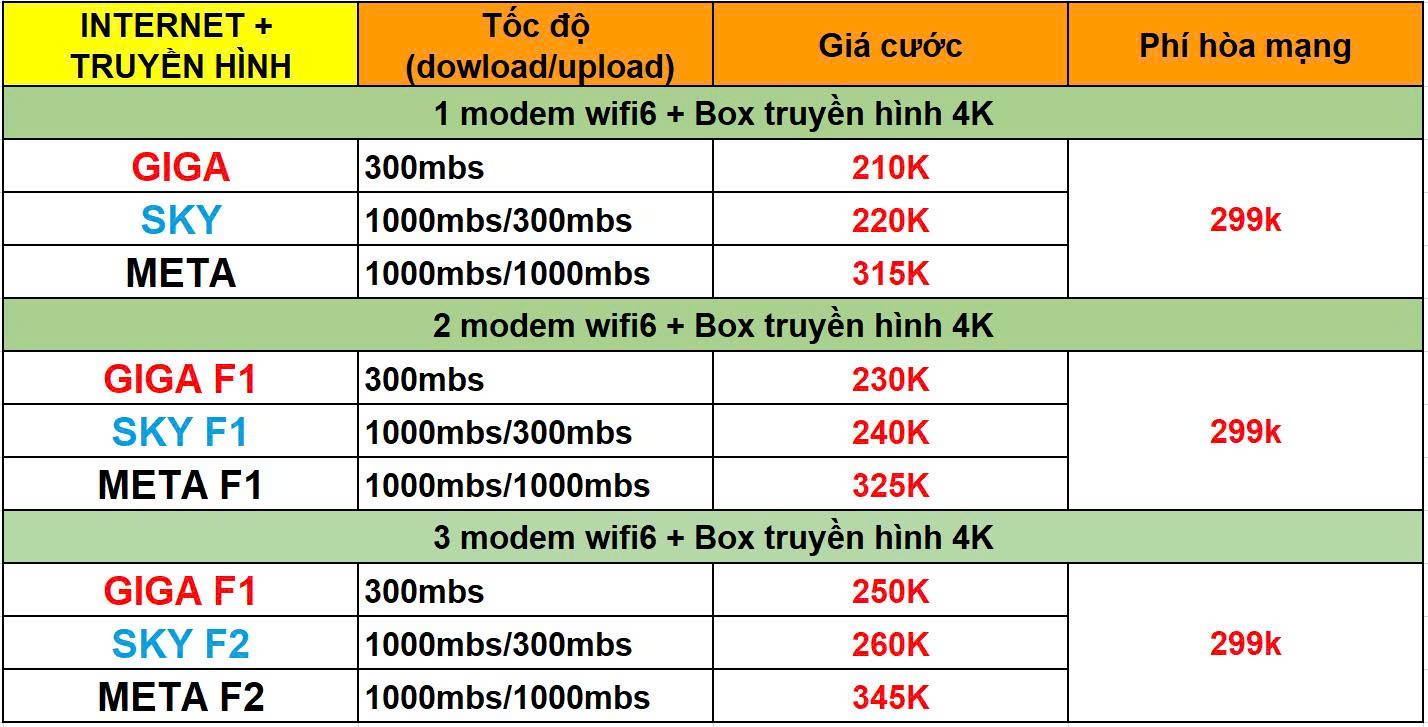 - Gói cước VIP combo mạng truyền hình ngoại hạng anh cước khu vực Hà Nội Và Hồ Chí Minh giá 299.000đ/Tháng. Phí hòa mạng 300.000đ.